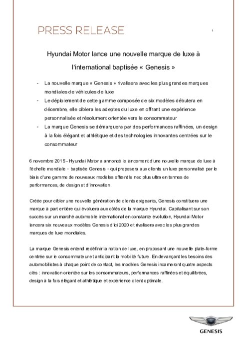 Hyundai Motor a annoncé le lancement d'une nouvelle marque de luxe à l'échelle mondiale – baptisée Genesis – qui proposera aux clients un luxe personnalisé par le biais d'une gamme de nouveaux modèles offrant le nec plus ultra en termes de performances, de design et d'innovation.
