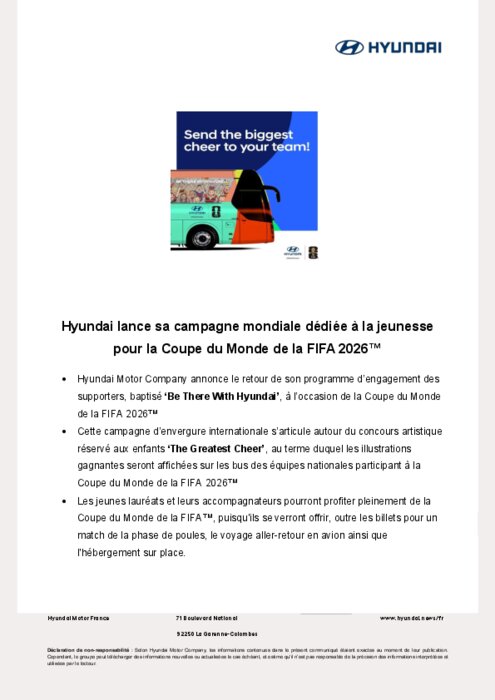 Hyundai Motor Company a annoncé le grand retour de son programme d’engagement des supporters de la Coupe du Monde de la FIFA, baptisé ‘Be There With Hyundai’, qui s'accompagnera d'une nouvelle initiative des plus enthousiasmantes lors de l’édition 2026.