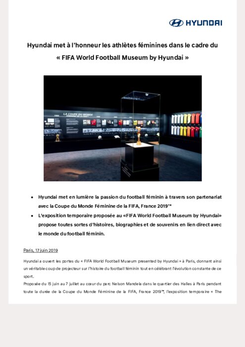 Hyundai a ouvert les portes du " FIFA World Football Muséum presented by Hyundai " à Paris, donnant ainsi un véritable coup de projecteur sur l’histoire du football féminin tout en célébrant l’évolution constante de ce sport. Proposée du 15 juin au 7 juillet au cœur du parc Nelson Mandela dans le quartier des Halles à Paris pendant toute la durée de la Coupe du Monde Féminine de la FIFA, France 2019, l’exposition temporaire the Women’s Game présente toutes sortes d’histoires, de biographies...