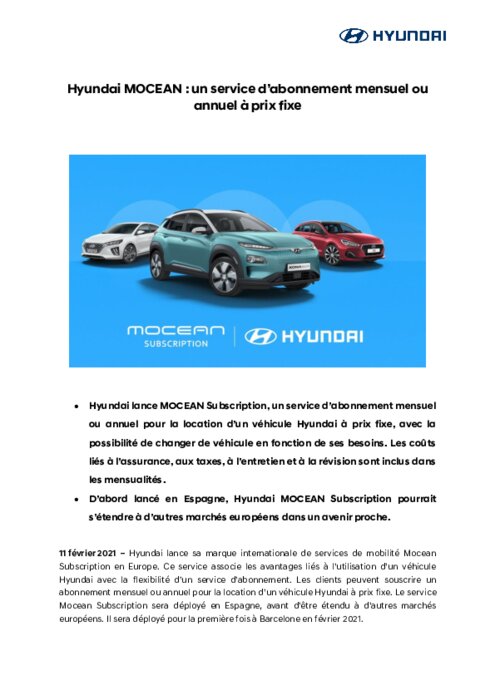 Hyundai lance sa marque internationale de services de mobilité Mocean Subscription en Europe. Ce service associe les avantages liés à l’utilisation d’un véhicule Hyundai avec la flexibilité d’un service d’abonnement. Les clients peuvent souscrire un abonnement mensuel ou annuel pour la location d’un véhicule Hyundai à prix fixe. Le service Mocean Subscription sera déployé en Espagne, avant d’être étendu à d’autres marchés européens. Il sera déployé pour la 1ère fois à Barcelone en février 2021.