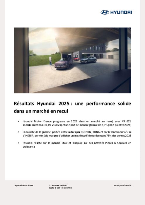 Hyundai Motor Europe partage, via un communiqué, ses résultats 2025 et ses ambitions pour les prochains mois. En 2025, avec plus de 600 000 immatriculations en Europe et une croissance à deux chiffres des ventes électrifiées, Hyundai confirme la montée en puissance de sa stratégie électrique et prépare une offensive produits majeure d’ici 2027