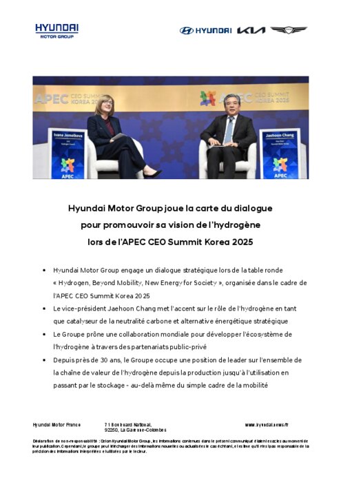 Hyundai Motor Group a engagé le 30 octobre un dialogue de haut niveau sur la stratégie hydrogène dans le cadre du CEO Summit Korea 2025 de la Coopération économique Asie-Pacifique (APEC). Jaehoon Chang, vice-président de Hyundai Motor Group et co-président du Conseil de l’hydrogène, s’est joint à Ivana Jemelkova, CEO du Conseil de l’hydrogène, pour échanger sur l’état actuel du secteur de l’hydrogène et sur son rôle pour favoriser une croissance durable dans la région Asie-Pacifique.