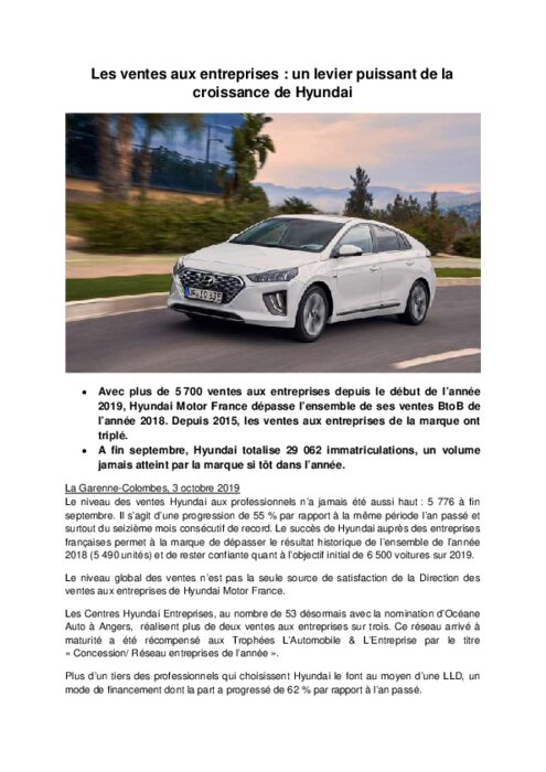 Le niveau des ventes Hyundai aux professionnels n’a jamais été aussi haut : 5 776 à fin septembre. Il s’agit d’une progression de 55 % par rapport à la même période l’an passé et surtout du seizième mois consécutif de record. Le succès de Hyundai auprès des entreprises françaises permet à la marque de dépasser le résultat historique de l’ensemble de l’année 2018 (5 490 unités) et de rester confiante quant à l’objectif initial de 6 500 voitures sur 2019.