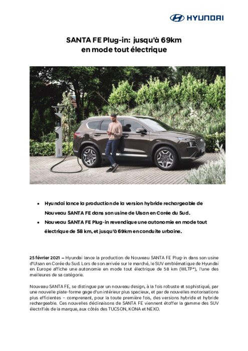 Hyundai lance la production de Nouveau SANTA FE Plug-in dans son usine d’Ulsan en Corée du Sud. Lors de son arrivée sur le marché, le SUV emblématique de Hyundai en Europe affiche une autonomie en mode tout électrique de 58 km (WLTP), l’une des meilleures de sa catégorie.