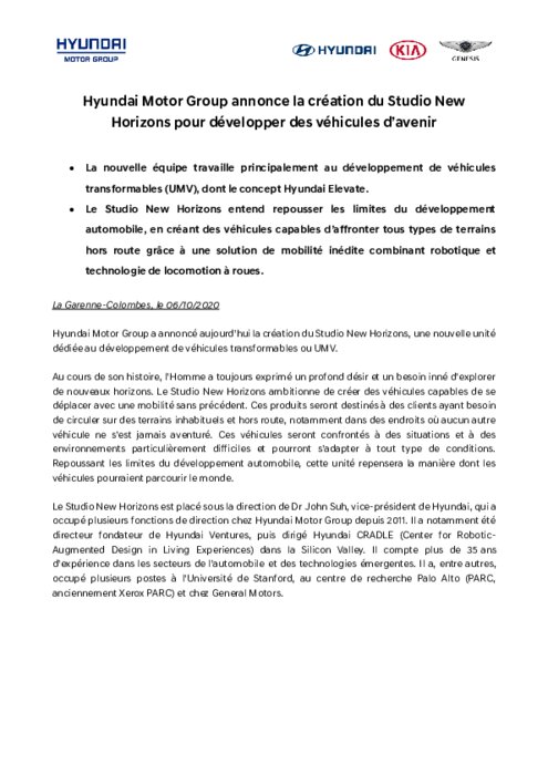 La nouvelle équipe travaille principalement au développement de véhicules transformables (UMV), dont le concept Hyundai Elevate. Le Studio New Horizons entend repousser les limites du développement automobile, en créant des véhicules capables d’affronter tous types de terrains hors route grâce à une solution de mobilité inédite combinant robotique et technologie de locomotion à roues.