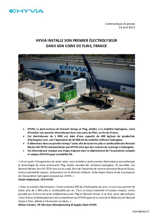 Hyvia, la joint-venture de Renault Group et Plug, dédiée à la mobilité hydrogène, vient d'installer son premier électrolyseur dans son usine de Flins, en Ile-de-France. Cet électrolyseur de 1 MW est doté d’une capacité de 400 kg/jour de production d’hydrogène vert, soit l’équivalent de 20 000 km de mobilité utilitaire hydrogène.