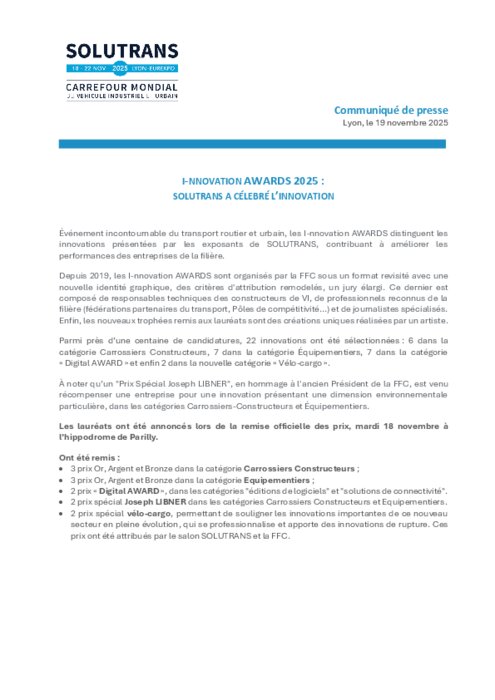 Événement incontournable du transport routier et urbain, les I-nnovation Awards distinguent les innovations présentées par les exposants de Solutrans, contribuant à améliorer les performances des entreprises de la filière.