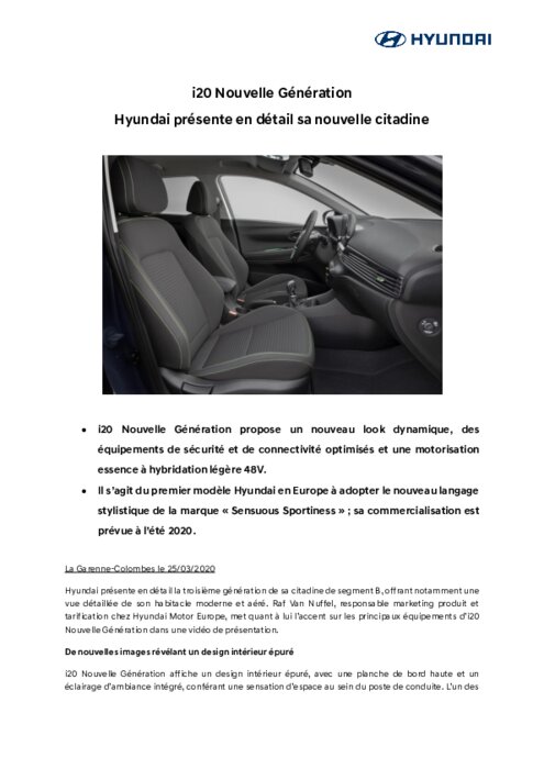 Hyundai présente en détail la troisième génération de sa citadine de segment B, offrant notamment une vue détaillée de son habitacle moderne et aéré. Raf Van Nuffel, responsable marketing produit et tarification chez Hyundai Motor Europe, met quant à lui l’accent sur les principaux équipements d’i20 Nouvelle Génération dans une vidéo de présentation.