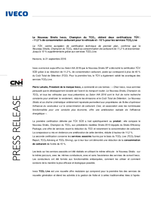 Iveco a annoncé vendrdi 23/09 au Salon IAA 2016 que le Nouveau Stralis XP a décroché la certification TÜV SÜD grâce à sa réduction de 11,2 %, de consommation carburant, poste qui correspond à plus de 40 % du Coût Total de Détention (TCO). Pour la première fois, le TÜV a également validé les avantages des services TCO2 Live.