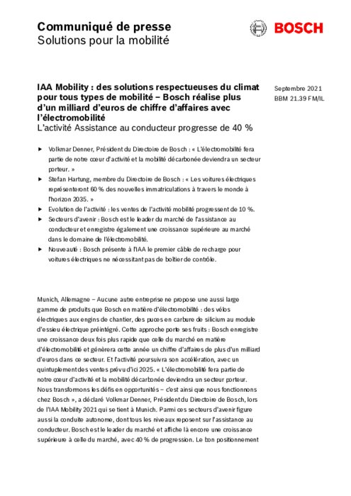 Aucune autre entreprise ne propose une aussi large gamme de produits que Bosch en matière d’électromobilité : des vélos électriques aux engins de chantier, des puces en carbure de silicium au module d’essieu électrique préintégré. Cette approche porte ses fruits : Bosch enregistre une croissance deux fois plus rapide que celle du marché en matière d’électromobilité et génèrera cette année un chiffre d’affaires de plus d’un milliard d’euros dans ce secteur.