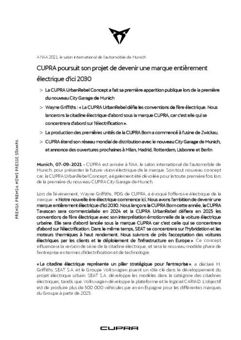 CUPRA est arrivée à l'IAA, le salon international de l'automobile de Munich, pour présenter la future vision électrique de la marque. Son tout nouveau concept car, la CUPRA UrbanRebel Concept, a également été dévoilée pour la toute première fois lors de la première du nouveau CUPRA City Garage de Munich.