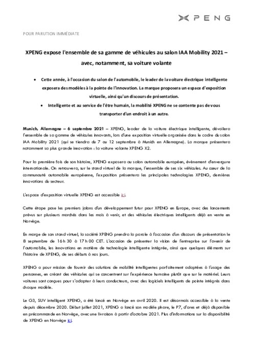 XPENG, leader de la voiture électrique intelligente, dévoilera l'ensemble de sa gamme de véhicules innovants, lors d'une exposition virtuelle organisée dans le cadre du salon IAA Mobility 2021 (qui se tiendra du 7 au 12 septembre à Munich en Allemagne).Pour la première fois de son histoire, XPENG exposera, sur son stand virtuel, l'ensemble de ses six véhicules. Au cœur de la communauté automobile européenne, l'exposition présentera les principales technologies XPENG...
