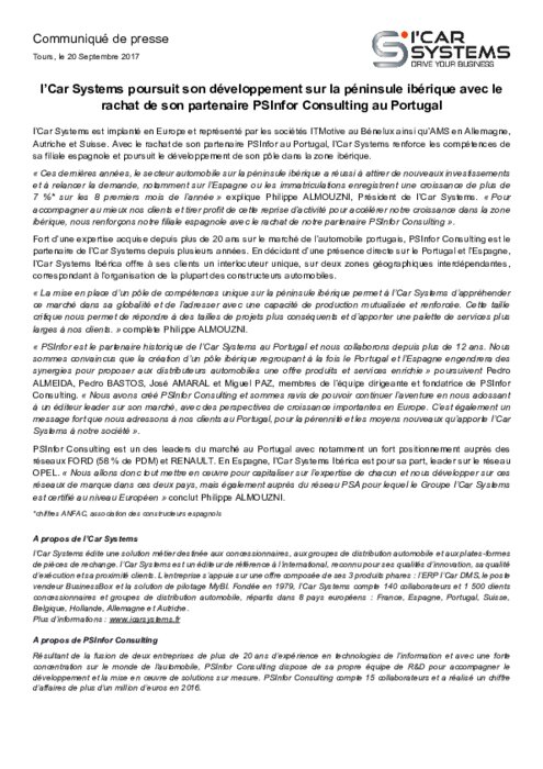 I’Car Systems, éditeur de solutions métier destinées aux concessionnaires, aux groupes de distribution automobile et aux plates-formes de pièces de rechange, poursuit son développement sur la péninsule ibérique avec le rachat de son partenaire PSInfor Consulting au Portugal. I’Car Systems est implanté en Europe et représenté par les sociétés ITMotive au Bénelux ainsi qu’AMS en Allemagne, Autriche et Suisse.