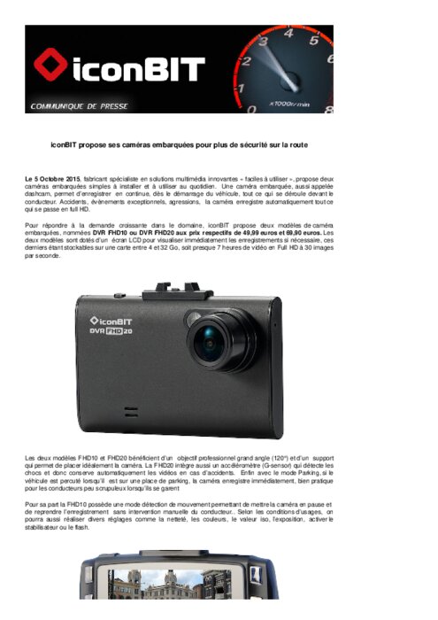 Fabricant spécialiste en solutions multimédia innovantes « faciles à utiliser », propose deux caméras embarquées simples à installer et à utiliser au quotidien. Une caméra embarquée, aussi appelée dashcam, permet d’enregistrer en continue, dès le démarrage du véhicule, tout ce qui se déroule devant le conducteur. Accidents, évènements exceptionnels, agressions, la caméra enregistre automatiquement tout ce qui se passe en full HD.