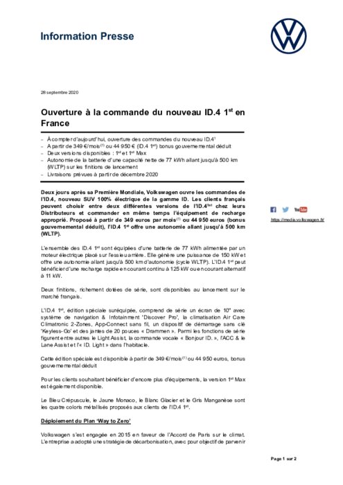 Deux jours après sa Première Mondiale, Volkswagen ouvre les commandes de l’ID.4, nouveau SUV 100% électrique de la gamme ID. Les clients français peuvent choisir entre deux différentes versions de l’ID.41st chez leurs Distributeurs et commander en même temps l’équipement de recharge approprié. Proposé à partir de 349 euros par mois(1) ou 44 950 euros (bonus gouvernemental déduit), l’ID.4 1st offre une autonomie allant jusqu’à 500 km (WLTP).