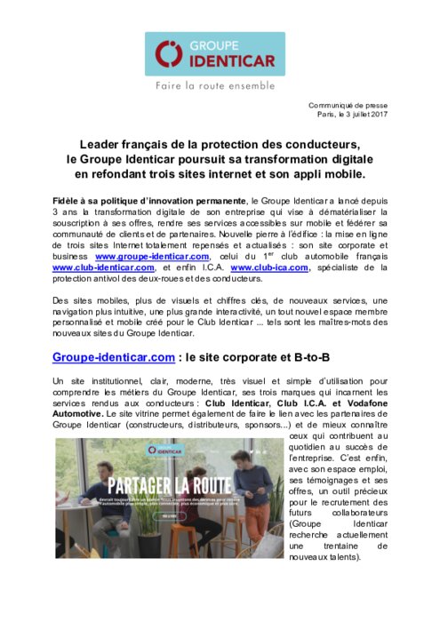Le Groupe Identicar a lancé depuis 3 ans la transformation digitale de son entreprise qui vise à dématérialiser la souscription à ses offres, rendre ses services accessibles sur mobile et fédérer sa communauté de clients et de partenaires. Nouvelle pierre à l’édifice : la mise en ligne de trois sites Internet totalement repensés et actualisés : son site corporate et business www.groupe-identicar.com, celui du 1er club automobile français www.club-identicar.com, et enfin I.C.A. www.club-ica.com.