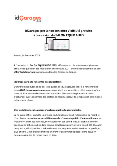 Réparateurs 06 octobre 2025 - 11:55 À l’occasion du SALON EQUIP AUTO 2025, IdGarages.pro, la plateforme digitale qui simplifie le quotidien des réparateurs auto depuis 2021, annonce le lancement de son offre Visibilité gratuite destinée à tous les garages de France. PDF (186 Ko) Télécharger © idGarages.pro
