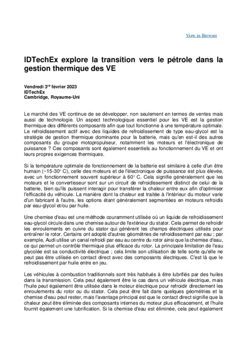 Le marché des VE continue de se développer, non seulement en termes de ventes mais aussi de technologie. Un aspect technologique essentiel pour les VE est la gestion thermique des différents composants afin que tout fonctionne à une température optimale. Le refroidissement actif avec des liquides de refroidissement de type eau-glycol est la stratégie de gestion thermique dominante pour la batterie, mais qu'en est-il des autres composants du groupe motopropulseur?