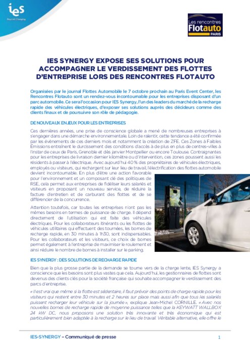 Organisées par le journal Flottes Automobile le 7 octobre prochain au Paris Event Center, les Rencontres Flotauto sont un rendez-vous incontournable pour les entreprises disposant d'un parc automobile. Ce sera l'occasion pour IES Synergy, l'un des leaders du marché de la recharge rapide des véhicules électriques, d'exposer ses solutions auprès des décideurs comme des clients finaux et de poursuivre son rôle de pédagogie.
