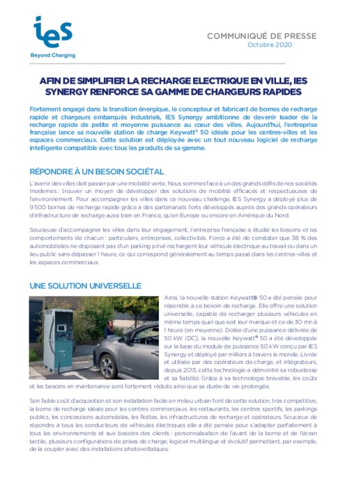 Le concepteur et fabricant de bornes de recharge rapide et chargeurs embarqués industriels, IES Synergy ambitionne de devenir leader de la recharge rapide de petite et moyenne puissance au cœur des villes. Aujourd’hui, l’entreprise lance sa nouvelle station de charge KeywattÒ 50 idéale pour les centres-villes et les espaces commerciaux. Cette solution est déployée avec un tout nouveau logiciel de recharge intelligente compatible avec tous les produits de sa gamme...
