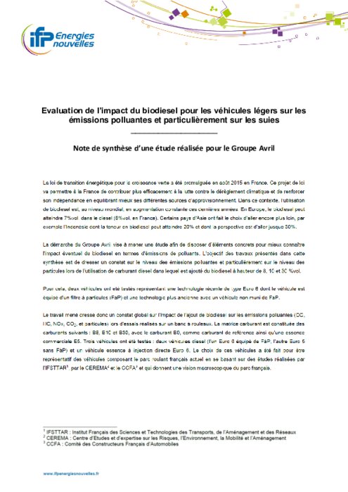 Une étude de l'IFP Energies Nouvelles (Ifpen) indique qu'un accroissement de l'incorporation de biodiesel dans les carburants engendre une baisse significative d'émission de particules polluantes par les voitures. Selon cette étude, un moteur utilisant 10% de biodiesel voit ainsi ses émissions de particules reculer de 20% par rapport au diesel conventionnel. Un chiffre porté à 43% lorsque le biodiesel est incorporé à hauteur de 30%.