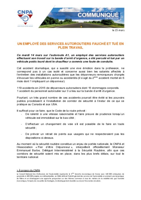 Ce mardi 14 mars sur l'autoroute A1, un employé des services autoroutiers effectuant son travail sur la bande d'arrêt d'urgence, a été percuté et tué par un véhicule poids lourd dont le chauffeur a commis une faute de conduite. Le CNPA et l’Association "Fier d’être Dépanneur", interpellent officiellement Monsieur Emmanuel Barbe, Délégué Interministériel à la Sécurité Routière, afin que ces corridors de sécurité soient mis en place, dans les plus brefs délais, sur tout le territoire national.