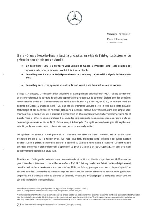 L'innovation a été présentée en avant-première en décembre 1980 : l'airbag conducteur et le prétensionneur de ceinture de sécurité (appelé à l'origine tendeur de ceinture) étaient alors les dernières innovations de pointe de Mercedes-Benz en matière de sécurité. Il y a 40 ans, en 1980, un nombre limité de berlines de Classe S (modèles série 126) ont été les premières voitures à être livrées avec cette nouvelle technologie et ont constitué un nouveau jalon dans la sécurité passive des véhicules.