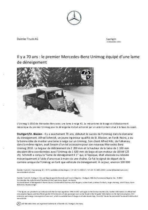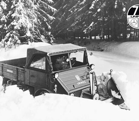 Il y a exactement 70 ans, débutait le succès de l'Unimog dans le domaine du déneigement. Alfred Schmidt, un jeune ingénieur qualifié de St. Blasien, en Forêt-Noire, a eu la bonne idée de monter une lame à neige sur un Unimog. Son client Alfred Hitz, de Falkenau, dans la même région, avait besoin d'un tel accessoire pour son nouveau Mercedes-Benz Unimog 2010.