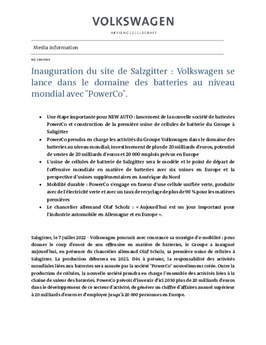 Volkswagen poursuit avec constance sa stratégie d'e-mobilité : pour donner le coup d'envoi de son offensive en matière de batteries, le Groupe a inauguré aujourd'hui, en présence du chancelier allemand Olaf Scholz, sa première usine de cellules à Salzgitter. La production débutera en 2025. Dès à présent, la responsabilité des activités mondiales liées aux batteries sera assurée par la société "PowerCo" nouvellement créée.