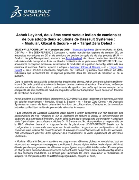 Dassault Systèmes, annonce que Ashok Leyland, deuxième constructeur de véhicules industriels et de transport en Inde, va étendre l’utilisation de sa plateforme 3DEXPERIENCE pour ses camions et autobus. Ashok Leyland a adopté « Modular, Glocal & Secure » et « Target Zero Defect », deux solution-expériences proposées par Dassault Systèmes pour relever les défis industriels que rencontrent les entreprises présentes dans les secteurs du transport et de la mobilité.