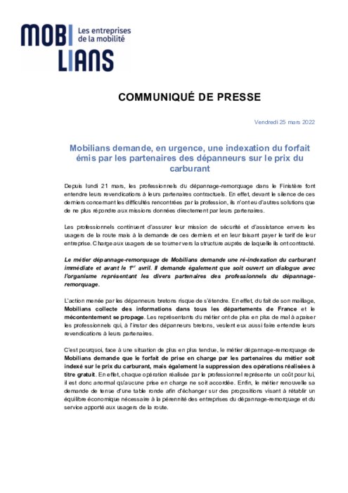 Le métier dépannage-remorquage de Mobilians demande une ré-indexation du carburant immédiate et avant le 1er avril. Il demande également que soit ouvert un dialogue avec l’organisme représentant les divers partenaires des professionnels du dépannage-remorquage. L’action menée par les dépanneurs bretons risque de s’étendre. En effet, du fait de son maillage, Mobilians collecte des informations dans tous les départements de France et le mécontentement se propage...