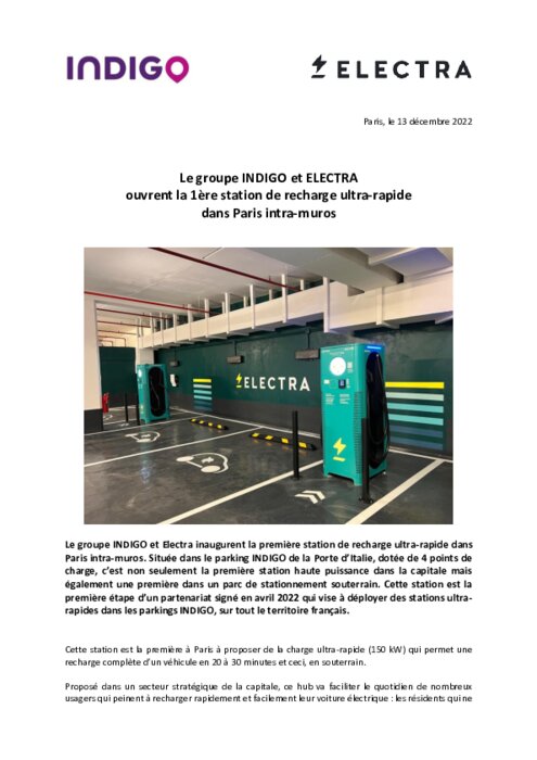 Le groupe INDIGO et Electra inaugurent la première station de recharge ultra-rapide dans Paris intra-muros. Située dans le parking INDIGO de la Porte d’Italie, dotée de 4 points de charge, c’est non seulement la première station haute puissance dans la capitale mais également une première dans un parc de stationnement souterrain. Cette station est la première étape d’un partenariat signé en avril 2022 qui vise à déployer des stations ultrarapides dans les parkings INDIGO.