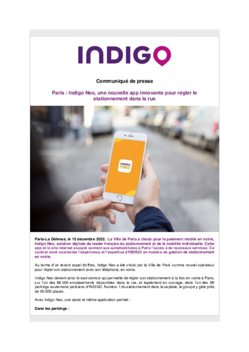 La Ville de Paris a choisi pour le paiement mobile en voirie, Indigo Neo, solution digitale du leader français du stationnement et de la mobilité individuelle. Cette app et le site internet associé ouvrent aux automobilistes à Paris l’accès à de nouveaux services. Ce contrat vient couronner l’expérience et l’expertise d’INDIGO en matière de gestion de stationnement en voirie.