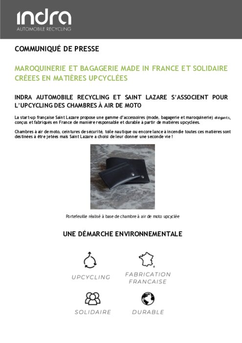La start-up française Saint Lazare propose une gamme d’accessoires (mode, bagagerie et maroquinerie) élégants, conçus et fabriqués en France de manière responsable et durable à partir de matières upcyclées. Chambres à air de moto, ceintures de sécurité, toile nautique ou encore lance à incendie toutes ces matières sont