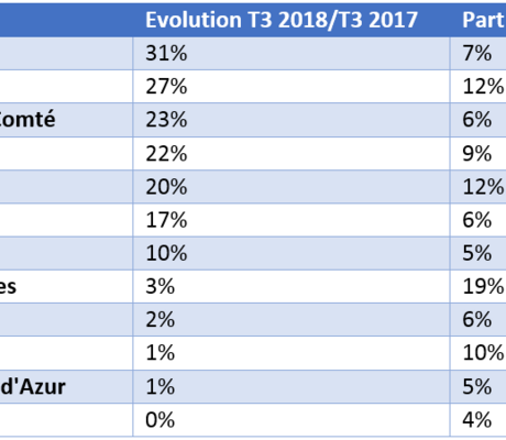 Avec +31% d’offres d’emplois par rapport au troisième trimestre 2017, la Nouvelle-Aquitaine est la région avec la plus forte croissance. En seconde place, on retrouve le Grand-Est (+27%) et la Bourgogne-Franche-Comté (+23%).