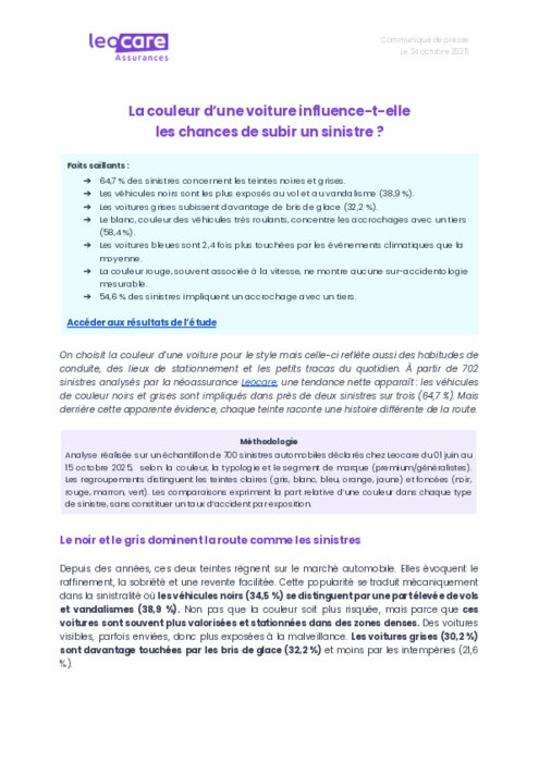 On choisit la couleur d’une voiture pour le style mais celle-ci reflète aussi des habitudes de conduite, des lieux de stationnement et les petits tracas du quotidien. À partir de 702 sinistres analysés par la néoassurance Leocare, une tendance nette apparaît : les véhicules de couleur noirs et grises sont impliqués dans près de deux sinistres sur trois (64,7 %). Mais derrière cette apparente évidence, chaque teinte raconte une histoire différente de la route.