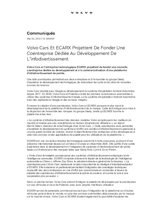 Constructeurs 24 mars 2021 - 14:02 Volvo Cars et l’entreprise technologique ECARX projettent de fonder une nouvelle coentreprise dédiée au développement et à la commercialisation d’une plateforme d’infodivertissement de pointe. PDF (153 Ko) Télécharger