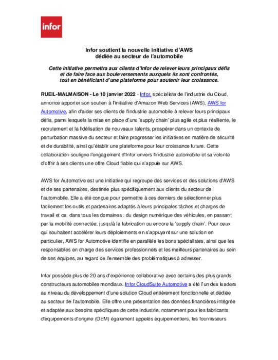 Infor, spécialiste de l’industrie du Cloud, annonce apporter son soutien à l’initiative d'Amazon Web Services (AWS), AWS for Automotive, afin d'aider ses clients de l'industrie automobile à relever leurs principaux défis, parmi lesquels la mise en place d’une ‘supply chain’ plus agile et plus résiliente, le recrutement et la fidélisation de nouveaux talents, prospérer dans un contexte de perturbation massive du secteur et faire progresser les initiatives en matière de sécurité et de durabilité.