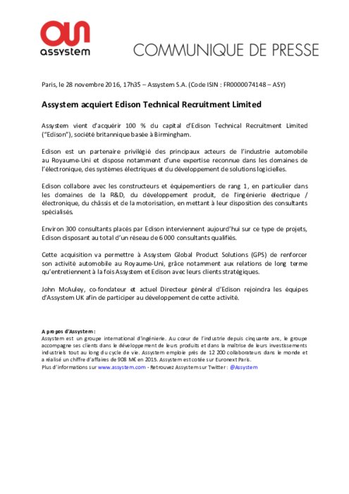 Le groupe international d'ingénierie Assystem annonce l'acquisition à 100% du capital d'Edison Technical Recruitment Limited, société britannique et partenaire des principaux acteurs de l'industrie automobile au Royaume-Uni.