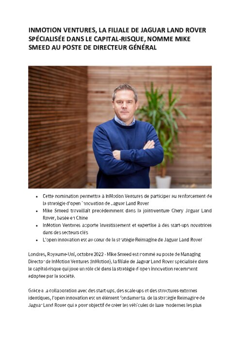 Constructeurs, Services 14 novembre 2022 - 10:37 Mike Smeed est nommé au poste de Managing Director de InMotion Ventures (InMotion), la filiale de Jaguar Land Rover spécialisée dans le capital-risque qui joue un rôle clé dans la stratégie d'open innovation récemment adoptée par la société. PDF (873 Ko) Télécharger