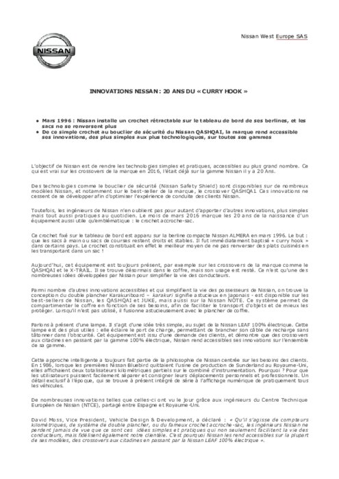 Mars 1996: Nissan installe un crochet rétractable sur le tableau de bord de ses berlines, et les sacs ne se renversent plus. De ce simple crochet au bouclier de sécurité du Nissan QASHQAI, la marque rend accessible ses innovations, des plus simples aux plus technologiques, sur toutes ses gammes. L’objectif est de rendre les technologies simples et pratiques, accessibles au plus grand nombre. Ce qui est vrai sur les crossovers de la marque en 2016, l’était déjà sur la gamme Nissan il y a 20 ans.