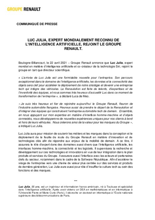 Constructeurs 22 avril 2021 - 17:16 Groupe Renault annonce que Luc Julia, expert mondial en matière d’intelligence artificielle et co-créateur de la technologie Siri, rejoint le groupe en tant que directeur scientifique. PDF (150 Ko) Télécharger