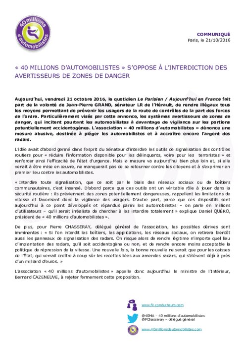 Le 21 octobre 2016, Le Parisien/Aujourd’hui en France fait part de la volonté de Jean-Pierre GRAND, sénateur LR de l’Hérault, de rendre illégaux tous les moyens permettant de prévenir les usagers de la route de contrôles de la part des forces de l’ordre. Visés par cette annonce, les systèmes avertisseurs de zones de danger, qui incitent les automobilistes à davantage de vigilance sur les portions potentiellement accidentogènes. L’association "40MA" dénonce une mesure abusive...