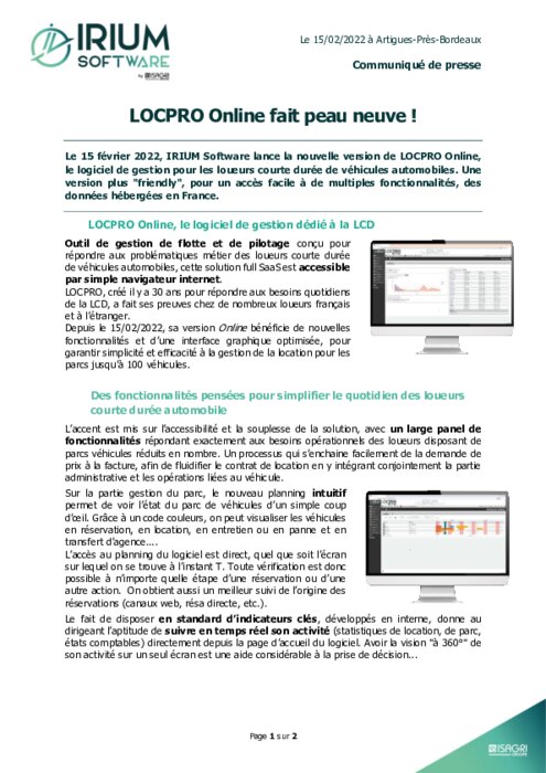 Le 15 février 2022, IRIUM Software lance la nouvelle version de LOCPRO Online, le logiciel de gestion pour les loueurs courte durée de véhicules automobiles. Une version plus "friendly", pour un accès facile à de multiples fonctionnalités, des données hébergées en France.