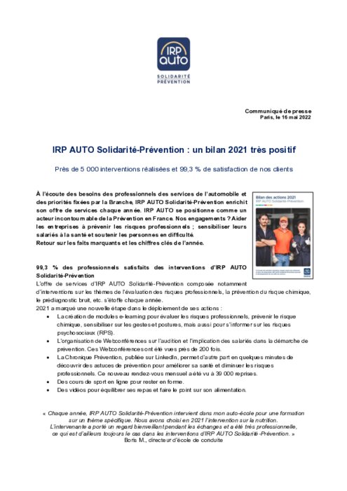 À l’écoute des priorités remontées chaque année par la Branche et force de proposition, IRP AUTO Solidarité-Prévention poursuit le développement de son offre de services. 99,3 % des professionnels satisfaits des interventions d’IRP AUTO Solidarité-Prévention.