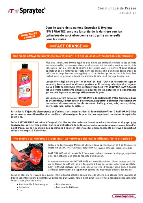 Lancée il y a déjà 50 ans par ITW SPRAYTEC, FAST ORANGE traverse les âges et permet grâce aux améliorations apportées au fil du temps de répondre toujours mieux à cette nécessité. En effet, véritable vedette d’ITW SPRAYTEC, FAST ORANGE est une crème nettoyante universelle pour les mains, naturelle et biodégradable qui nettoie, hydrate et protège efficacement la peau.