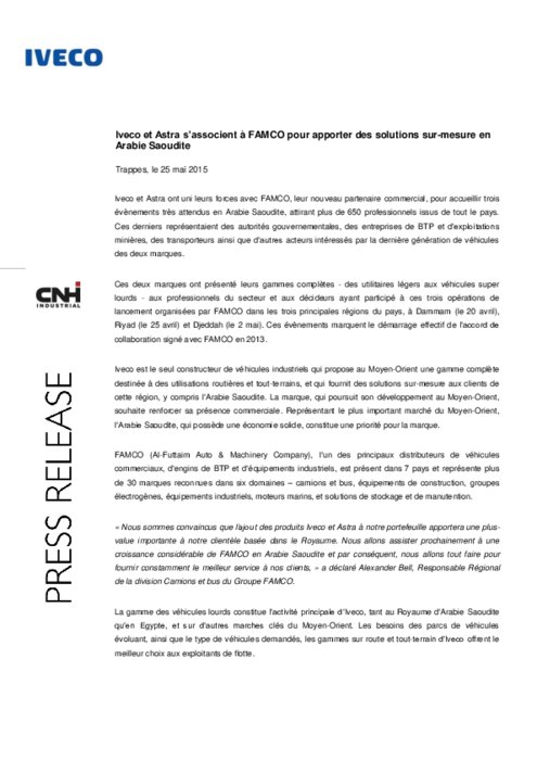 Iveco et Astra ont uni leurs forces avec FAMCO, leur nouveau partenaire commercial, pour accueillir trois évènements très attendus en Arabie Saoudite, attirant plus de 650 professionnels issus de tout le pays. Ces derniers représentaient des autorités gouvernementales, des entreprises de BTP et d’exploitations minières, des transporteurs ainsi que d’autres acteurs intéressés par la dernière génération de véhicules des deux marques.