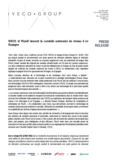 IVECO, la marque d’Iveco Group N.V. (EXM : IVG) qui conçoit, produit et commercialise une vaste gamme de véhicules utilitaires légers et véhicules industriels moyens et lourds, annonce un nouveau programme avec son partenaire de longue date PlusAI, leader mondial des logiciels de conduite virtuelle basés sur l'IA pour les camions autonomes. Les deux entreprises prévoient de lancer le premier déploiement en Europe du Sud de poids lourds équipés de systèmes de conduite autonome de niveau 4 (ADS), en collaboration avec l'opérateur logistique espagnol Sesé et le gouvernement d'Aragon, en Espagne.