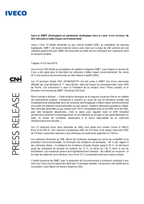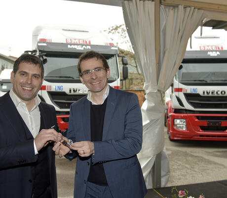 Iveco a livré 10 Stralis alimentés au gaz naturel liquéfié (GNL) au prestataire de services logistiques, SMET. Cet accord triennal conclu avec Iveco sur la base de 330 camions est une véritable opportunité pour SMET de renouveler sa flotte tout en renforçant son implication dans le transport durable.