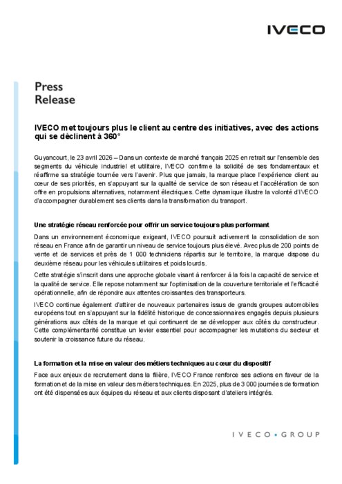 Dans un contexte de marché français 2025 en retrait sur l’ensemble des segments du véhicule industriel et utilitaire, Iveco confirme la solidité de ses fondamentaux et réaffirme sa stratégie tournée vers l’avenir. Plus que jamais, la marque place l’expérience client au cœur de ses priorités, en s’appuyant sur la qualité de service de son réseau et l’accélération de son offre en propulsions alternatives, notamment électriques. Cette dynamique illustre la volonté d’IVECO d’accompagner durablement ses clients dans la transformation du transport.